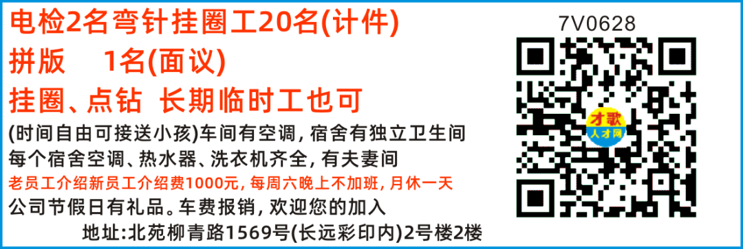 弯针夹片 挂圈工资:4000-7000包住不包吃(有餐补)工作时间:9 小时,月休2天另长时间招计件女工(周结)位置:东阳珊瑚里北区