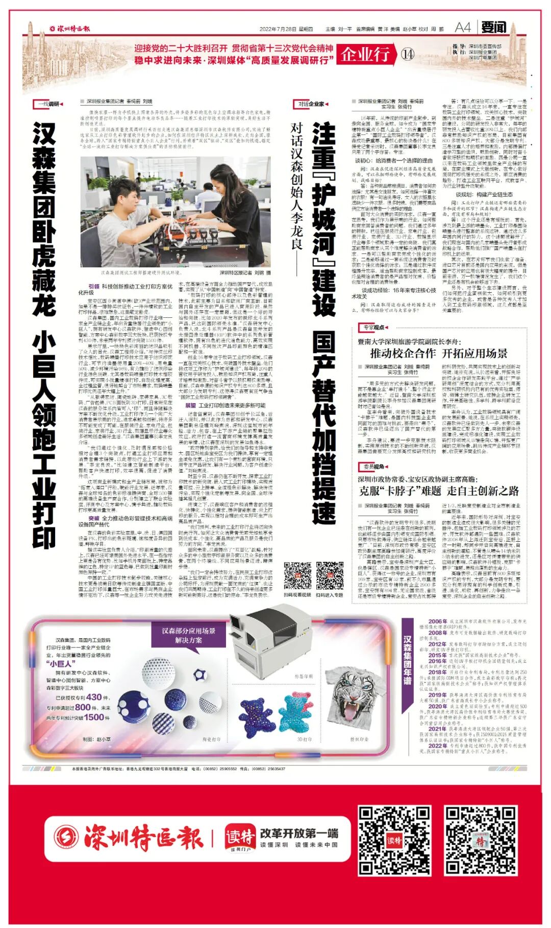 “从服装家纺、陶瓷地砖、家装家具、3C数码、宣传包装、PCB面板到3D打印,平常所见在汉森的服务体系内皆可入‘印’。况且伴同处理方法持续优化升级,工业打印做为一个向广大消费者展示美的行业,追求卓越和创新,将许多不可能变成为了可能,在服装行业、家电行业、包装行业、家装行业、3D行业、数据表示行业等众多行业创造美好生活。”汉森集团董事长李龙良介绍。突破 全力推动色彩管理技术和高端设备国产替代