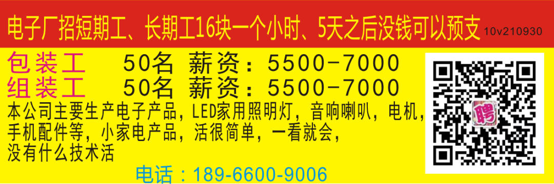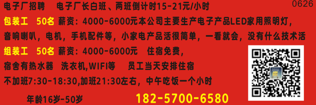 流水线普工: 50名(不会可学)计件工资薪水4500-8000元、男女不限,每月满勤奖150,月休2天,包吃包住
