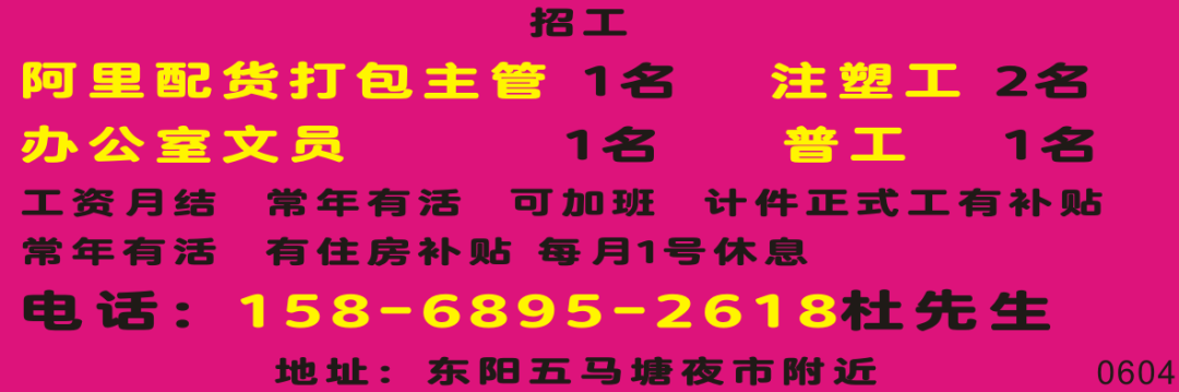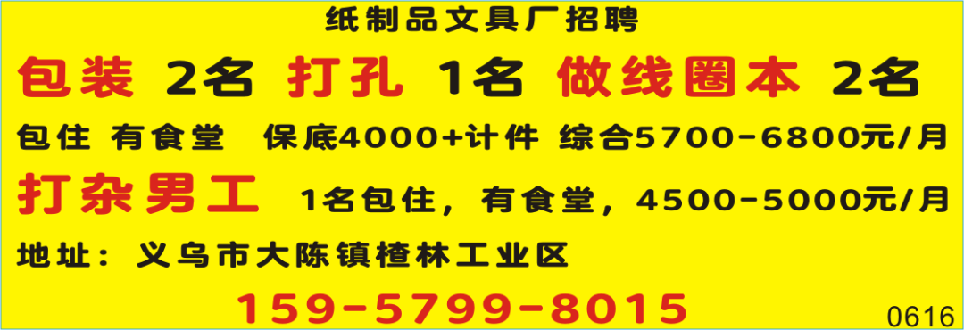 招 聘杂 工 2名工资5000包住 吃补300元/月月休1天位置:东阳凯旋路与甑山路交叉口南50米(宇龙机械院内)