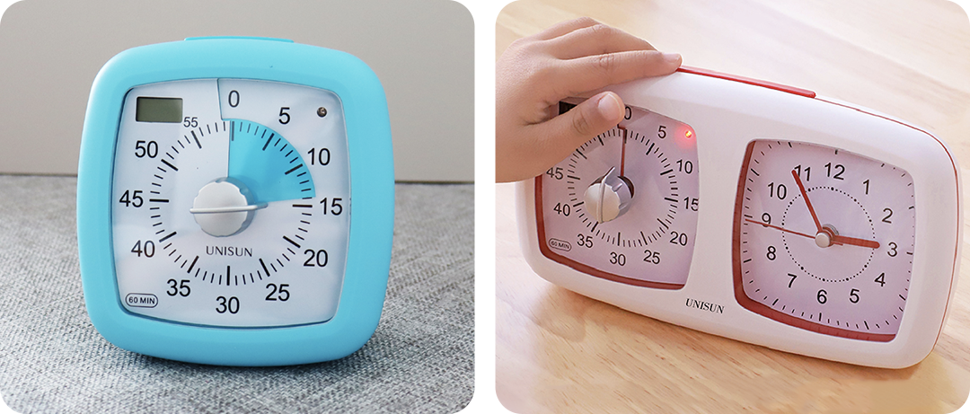 后来,我买了这台「可视化」的时间管理器,右边是一个正常的时钟,左边是1小时的表盘,转动旋钮就能够把任意时间「可视化」成一部分色块。