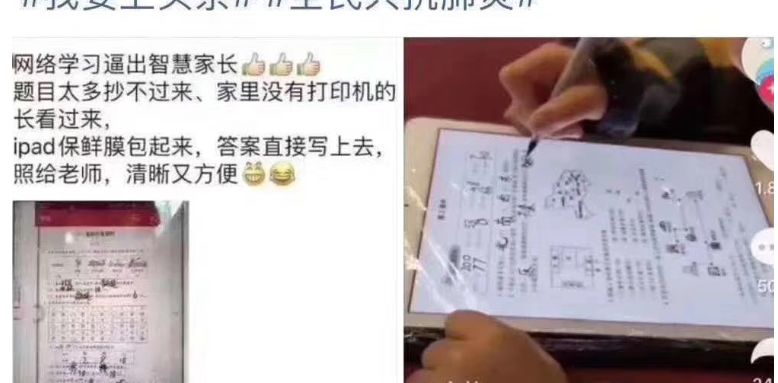 打印机还没到货的张芳被伴侣安利了一款作业“神器”,保鲜膜。据伴侣给张芳的发的照片表示,有家长用ipad下载作业电子版后,在平板上铺上一层保鲜膜,而后用笔触比较细的马克笔直接在保鲜薄上答题。作业完成后,家长直接拍照上传作业,让老师批阅。
