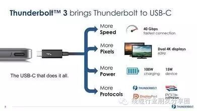 HDMI接口、家庭视屏系统的霸主,DP接口(免授权)、 PC或表示器端的宠儿,MHL接口、皇亲国戚,是基于HDMI阵营的高速复合应用接口,关联应用已在市售商品,家电上看到.Thunderbolt接口、是FireWire的升级版本,是英特尔开发和支持的一种标准,戴尔的XPS制品线和惠普的Elite x2平板,苹果的MAC系列,而在将来,光纤版的Thunderbolt承诺带来最高100Gbps的速度.故其为将来独一能够和USB TYPE C竞争的竞争对手,Type-C的USB接口、取代前代的因手机、平板、电脑及其他周边设备型号区别而产生多样版本的USB Type-A和Type-B,Type-C支持更快速的10Gbps USB 3.1 gen 2 spec.