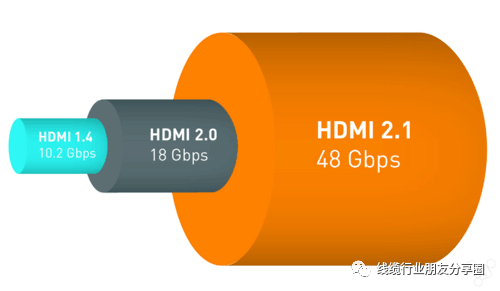 为了完美实现新的HDMI 2.1 规范,传输线缆规格需要再一次变革,标准的传输速率需要达到48Gbps,充足的带宽以保证更高帧速率和色域的内容传输.早前的 HDMI 1.4版为10.2Gbps,目前较为广泛的HDMI 2.0版是16Gbps,HDMI 2.0b 最低18Gpbs,这些数字与 HDMI 2.1 的 48Gbps 相比都远远落后,况且基本没法相容.