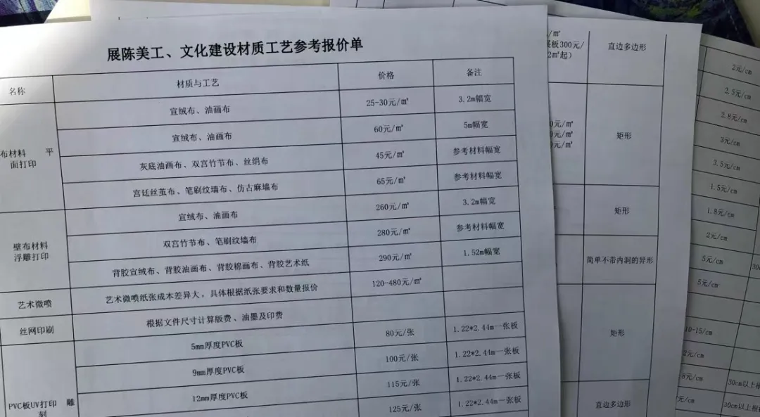 3、工艺参考价格表(电子版)展陈美工、文化建设材质工艺参考价格表,下单后找客服索取